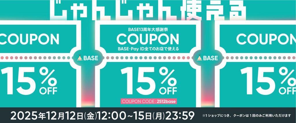 【12/12~15限定】BASE13周年大感謝祭 1購入につき、1クーポン。商品購入画面でクーポンコードを入力すると、割引金額でご購入いただけます! ・15%OFFクーポン(上限1,000円) クーポンコード:2512base